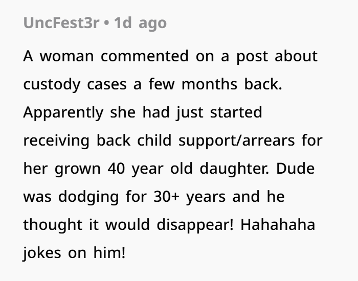 This story isn’t just about revenge or payback. It’s about persistence, protecting your kid, and not letting deadbeats off the hook just because time has passed. It’s also a reminder that sometimes the system works — even if it takes 15 years.