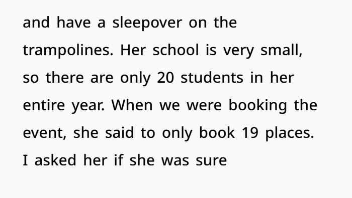 My daughter (13F) had a big birthday this weekend. We booked a sleepover party at a trampoline park with her entire year at school (19 kids were invited). She told me there were only 19 kids in her year and I trusted that. We marketed the invites accordingly.