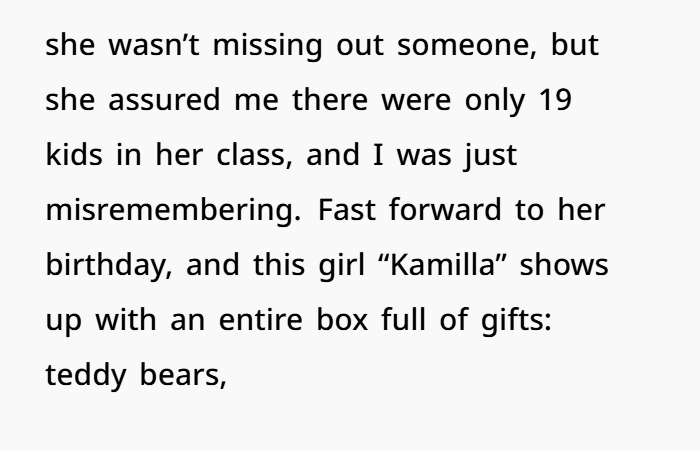 In your case: you DID invite all 19 kids in that year. So you had the “everyone in class” model, not a small selection. That means excluding one child became much more visible — everyone else got invited except Kamilla (if we assume she is indeed in that year and not an “extra”). That heightens the hurt/appearance of unfairness.