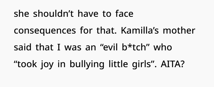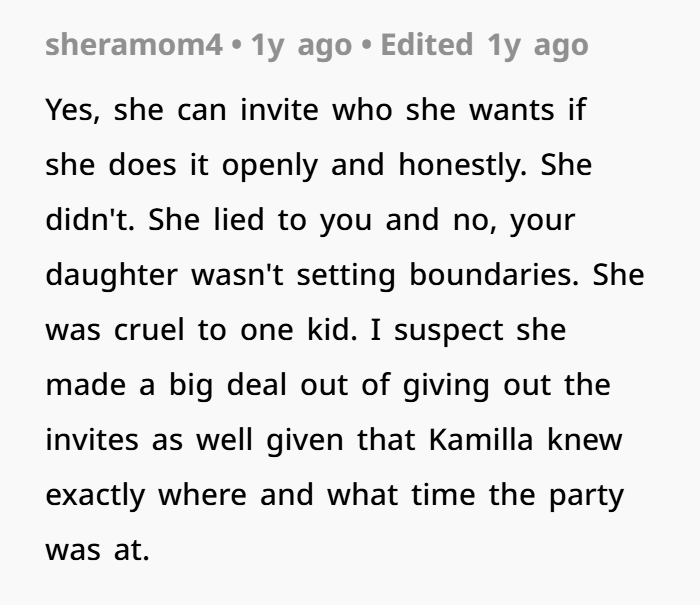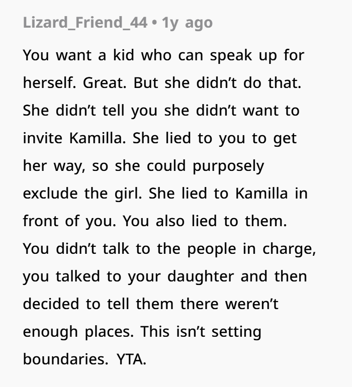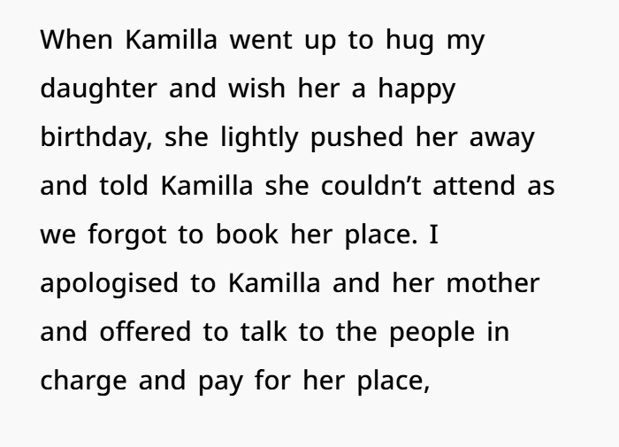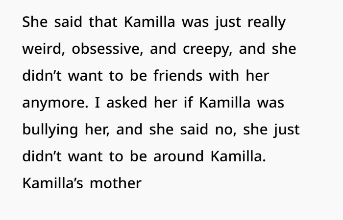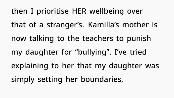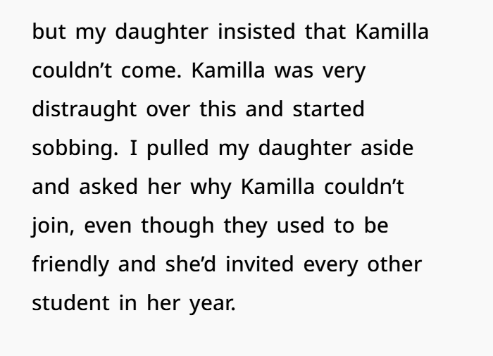 You told Kamilla’s mother you wouldn’t raise your daughter as a doormat and you prioritise your daughter’s wellbeing over “a stranger’s.” That’s fair from a protective parent perspective. But it’s how you framed it (and the tone) that matters. If this exclusion turns into the message: “You can treat people this way because you’re uncomfortable,” then you risk modelling exclusion rather than inclusion.