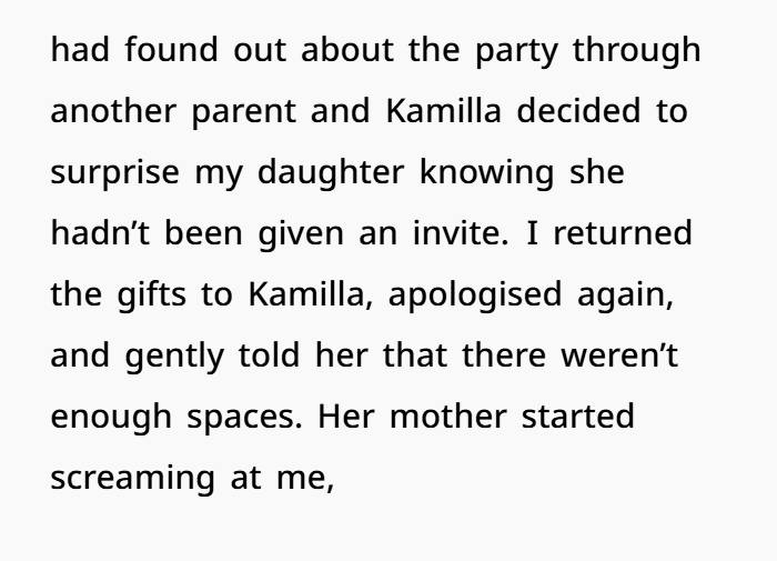 One concern: Did you communicate clearly to Kamilla’s parent when you invited everyone else except her? Or did you simply not invite her and hope no one would notice? From your description, Kamilla assumed she was invited; her mother found out through another parent and Kamilla turned up with gifts. That indicates a communication breakdown and social hurt.