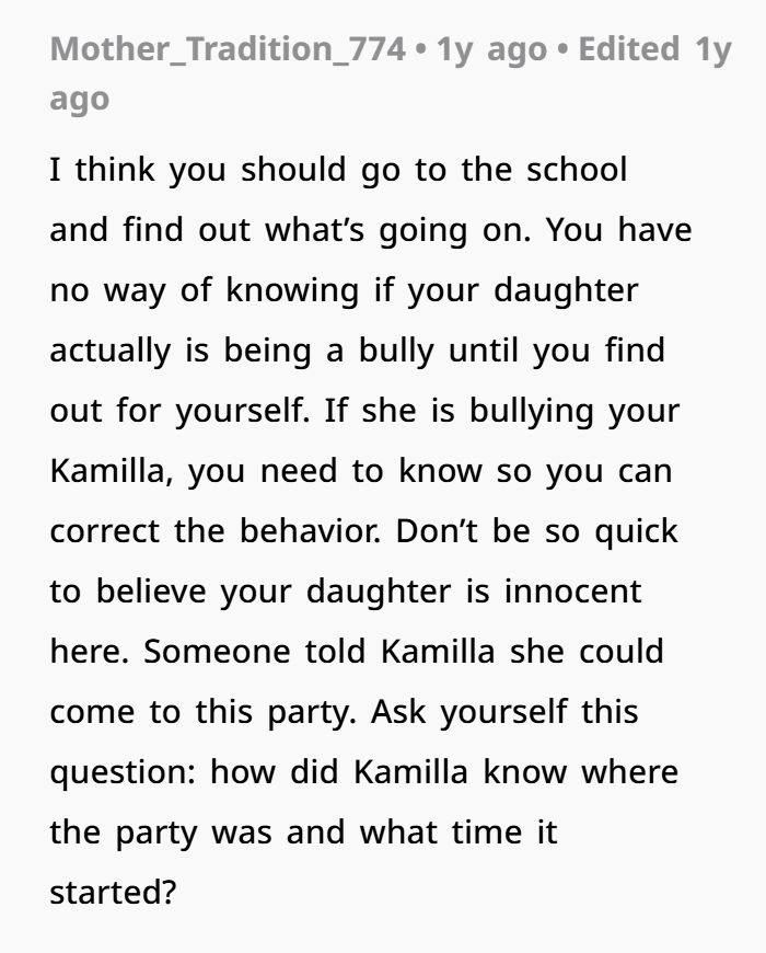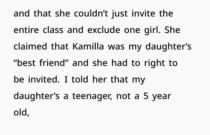• If the school gets involved, explain calmly: this was your daughter’s birthday party guest list; you invited the class but your daughter opted not to include one friend. That is within your discretion, but perhaps you can express regret for the hurt caused and offer to talk to Kamilla’s mother.