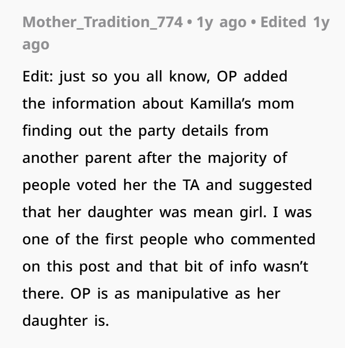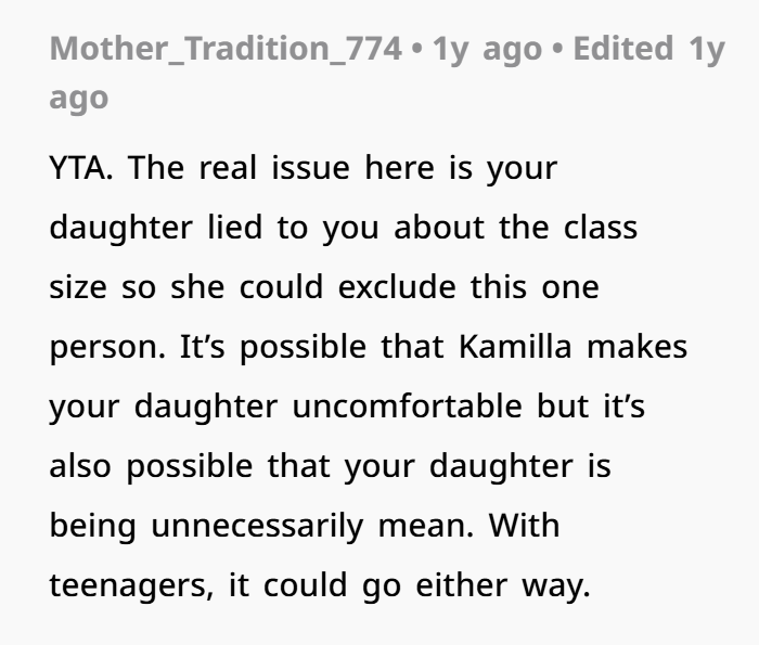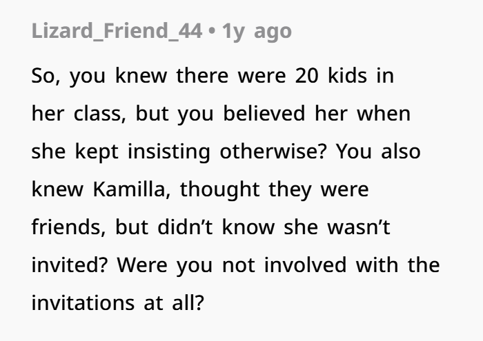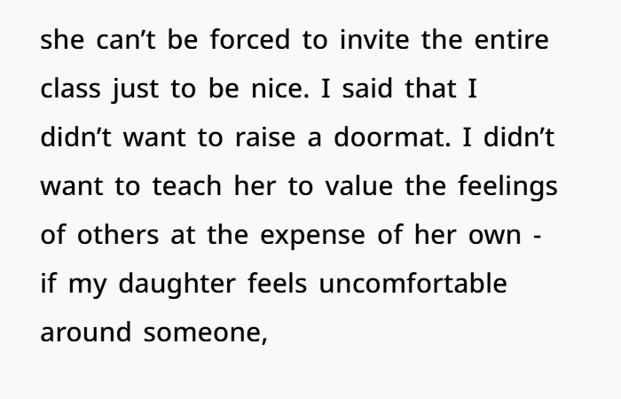 My verdict: NTA (Not The Asshole) in the sense that you aren’t obligated to force your daughter to host someone she doesn’t want. But you did make a questionable call by limiting invites to all except one—i.e., you entered a zone where exclusion becomes problematic. You might have done better to either invite all including Kamilla, or invite a small friend group (not whole class) so that excluding someone didn’t cut so publicly. So while you are not the asshole, you did step into grey area and could do better in handling the hurt caused.