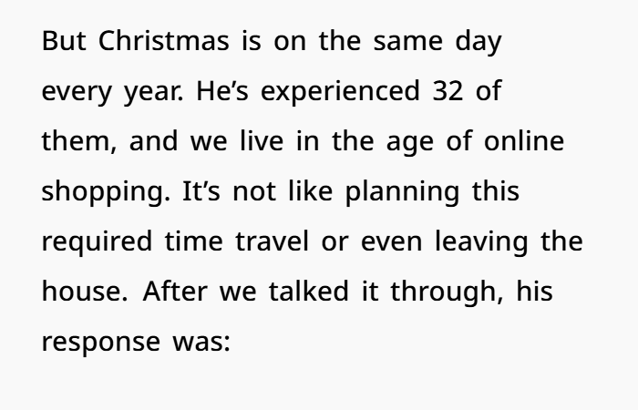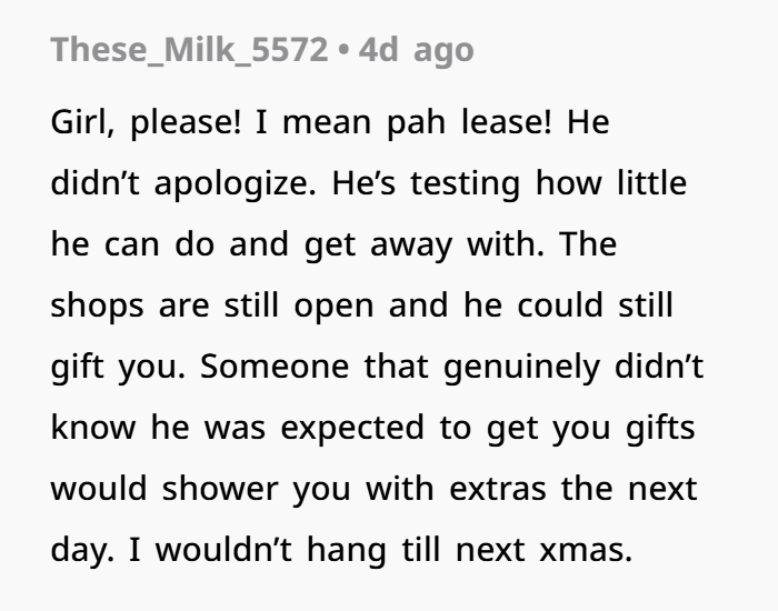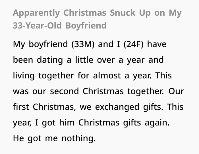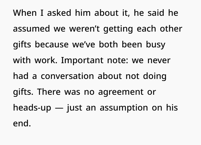 This year? You bought him gifts. He bought you zero — not one thing. When you brought it up, he said he assumed you weren’t exchanging gifts because work has been busy. No talk. No plan. Just “I didn’t think about it.”