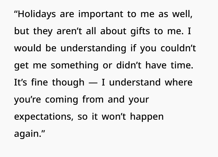 “I’m not upset about the lunch box or a gift itself. I’m upset because I felt unconsidered and like my feelings weren’t fully acknowledged. Christmas was important to me, and it hurt that you made no effort to show you were thinking about it. I want us to communicate expectations better so we’re not in this situation again.”