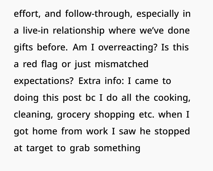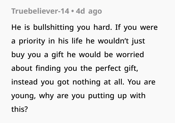 But when she found out that he didn’t buy her a single present, she began questioning their entire relationship