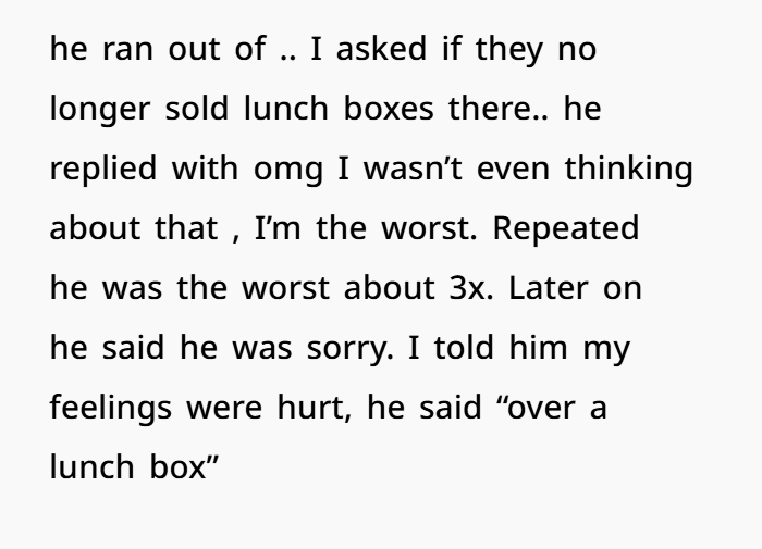 You are not dramatic. You are not “over a lunch box.” You are reacting to emotional neglect and poor communication. That’s something most relationship therapists would tell you to address early — not ignore.