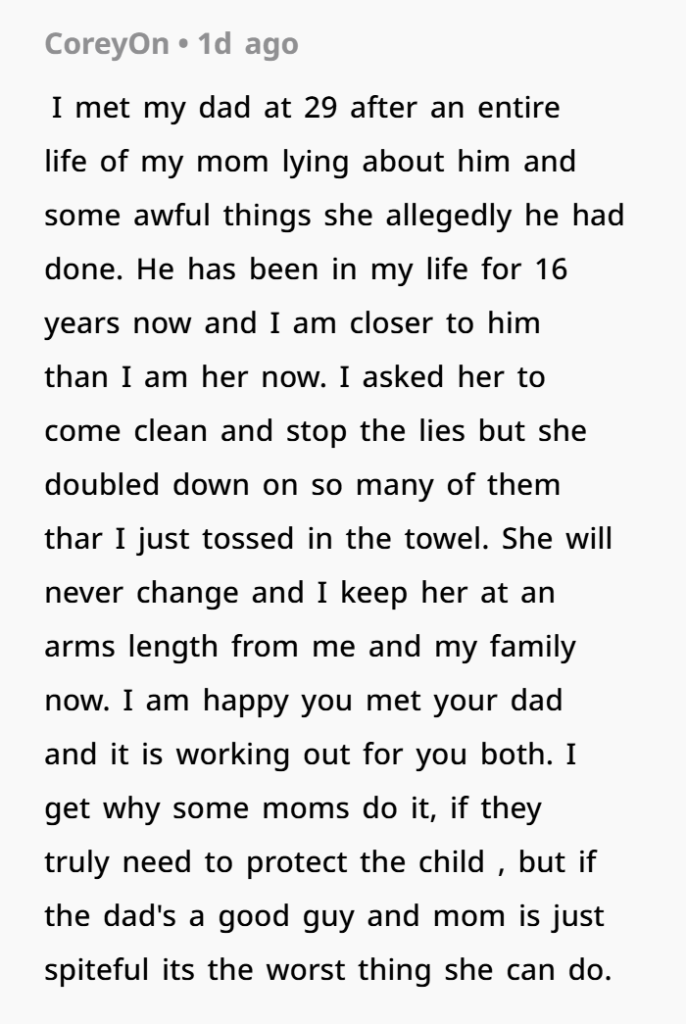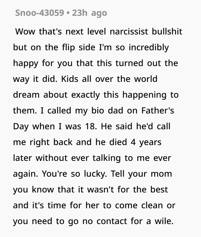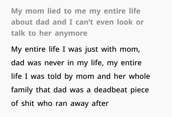 In the comments, readers said the guy’s mom hadn’t just lied to him, she’d also committed an act of pure and unforgivable cruelty and didn’t deserve his forgiveness