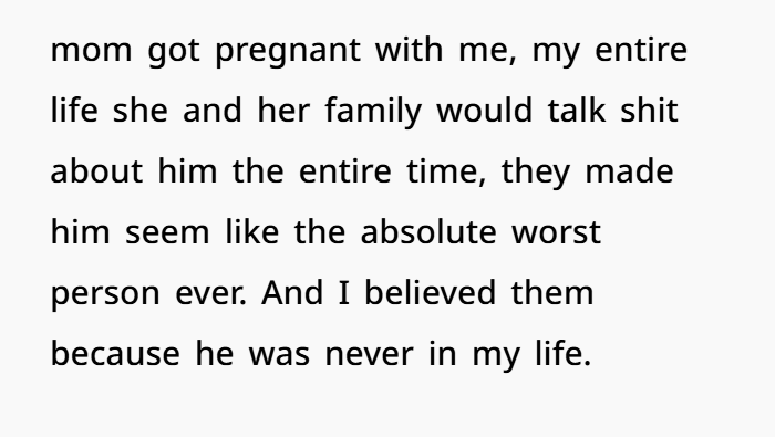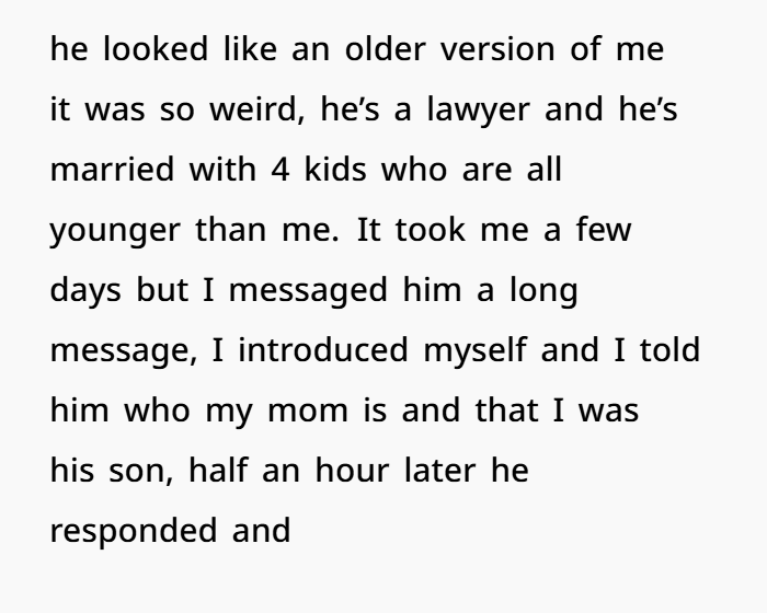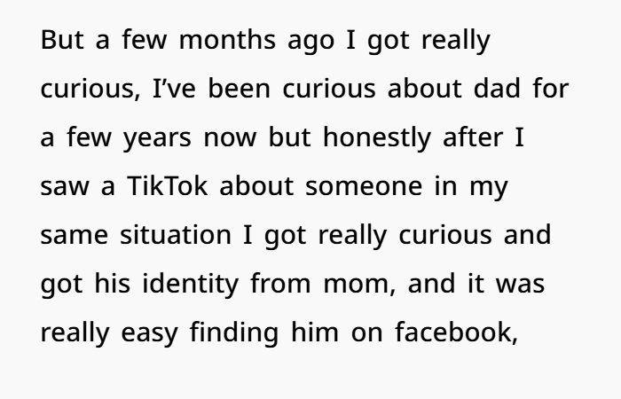 But something changed a few months ago. I don’t know exactly what sparked it, but I started getting really curious about him. After years of hearing nothing but bad things, I began to wonder if there was another side to the story. It wasn’t until I saw a TikTok about someone else who had a similar situation that I decided to take a chance and find out for myself. I got his full name from my mom, and it wasn’t hard to track him down on Facebook. He looked so much like me—like an older version of me. That’s when everything started to hit me. I couldn’t believe I’d never known this person existed in my life.