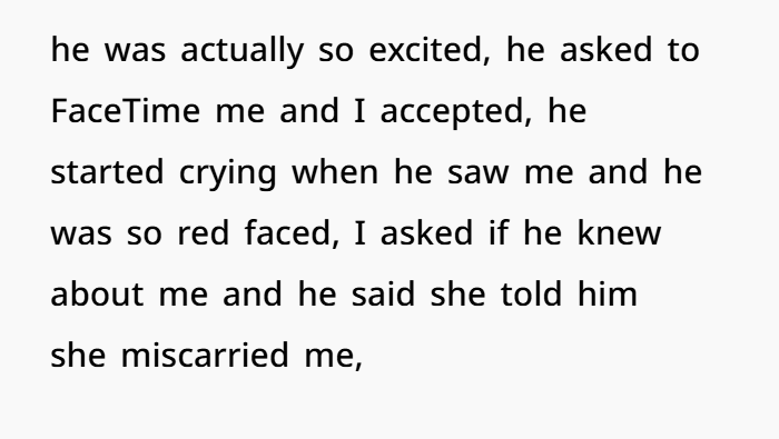 I sent him a message, and within half an hour, he replied. What followed was nothing like I expected. He wasn’t the horrible person my mom had made him out to be. In fact, he seemed so excited to hear from me. We FaceTimed, and he was overwhelmed with emotion. He started crying when he saw me, and I could see how much he wanted to be part of my life. It turned out that he had no idea I even existed. My mom had told him that I didn’t survive, that I was a miscarriage, and it broke him. He kept apologizing for not being in my life, and the more we talked, the more I could feel how much he cared.