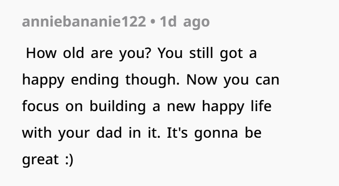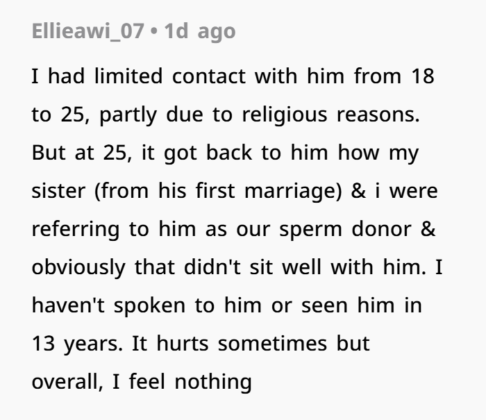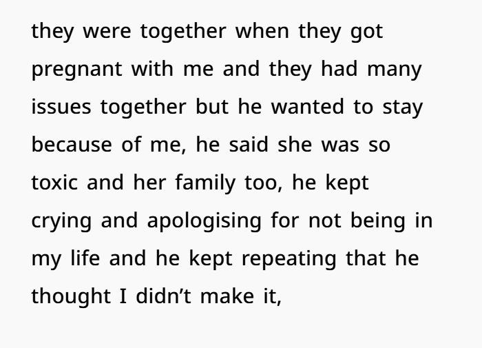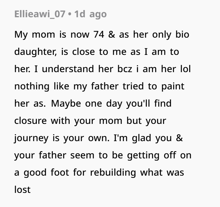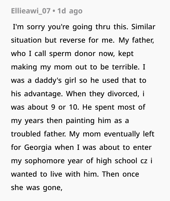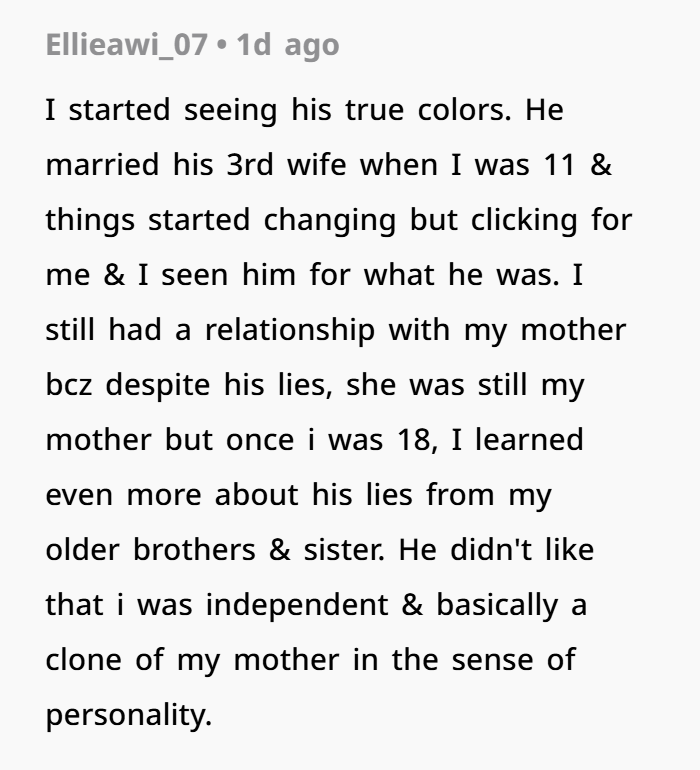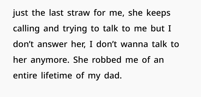 But here’s where things get complicated—my mom. The more I’ve learned about my dad, the more I’ve distanced myself from her. I can’t bring myself to look at her the same way anymore. The lies, the manipulation—it’s all too much. She made me believe my dad was this horrible person when, in reality, he was the complete opposite. She robbed me of an entire relationship with someone who could’ve been there for me my whole life. Now, I’ve been avoiding her calls and texts. I can’t even look at her without feeling betrayed. I feel like I’ve lost a lifetime with my dad, and I don’t know if I can forgive her for that.