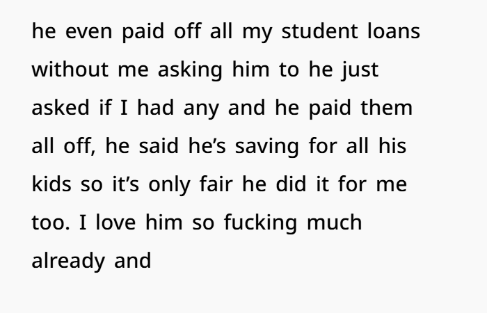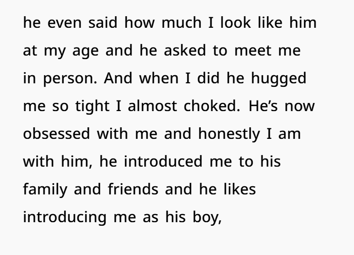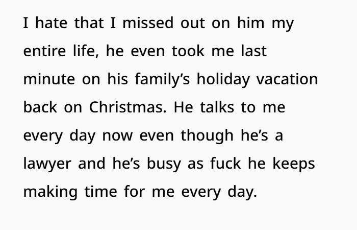 Since then, everything has changed. I’ve met his whole family—he’s married with four kids, and they’ve welcomed me with open arms. It’s hard not to feel overwhelmed by all the love and attention. He even went out of his way to pay off my student loans. I never asked him to do that, but he said he wanted to make sure I didn’t struggle like he did when he was younger. He’s saving for his own kids, but he wanted to include me in that plan because I’m his son too. It’s been crazy how much he’s done for me in such a short amount of time.