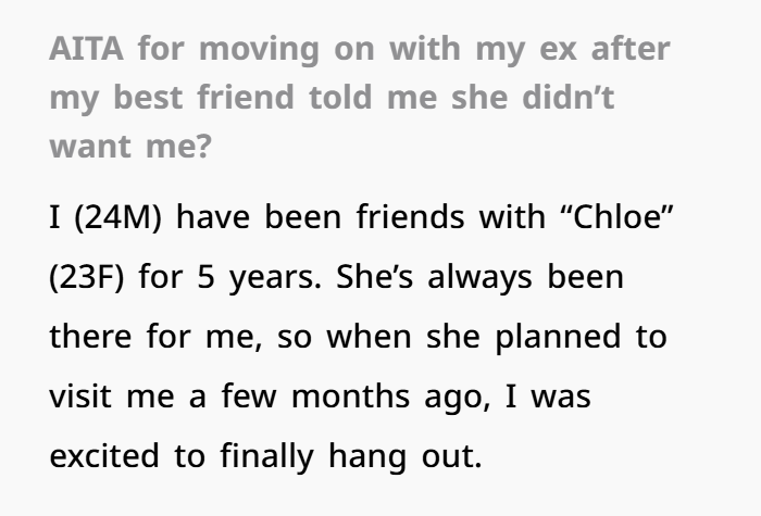 The author of the post is a young man whose bestie, “Chloe,” had been rejecting all of his romantic hints for years