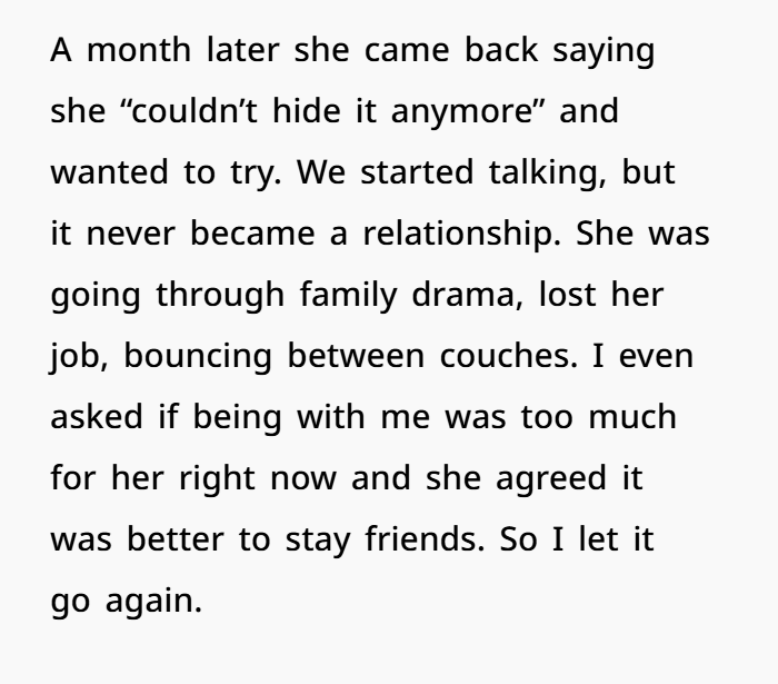 About a month later she changed her mind and said she “couldn’t hide it anymore” and wanted to try. We started talking—but it wasn’t a proper relationship. She was going through family drama, lost her job, and was unstable (moving between couches). I asked if being with me was too much right now; she agreed and said it was better we just stay friends. So I let it go again.