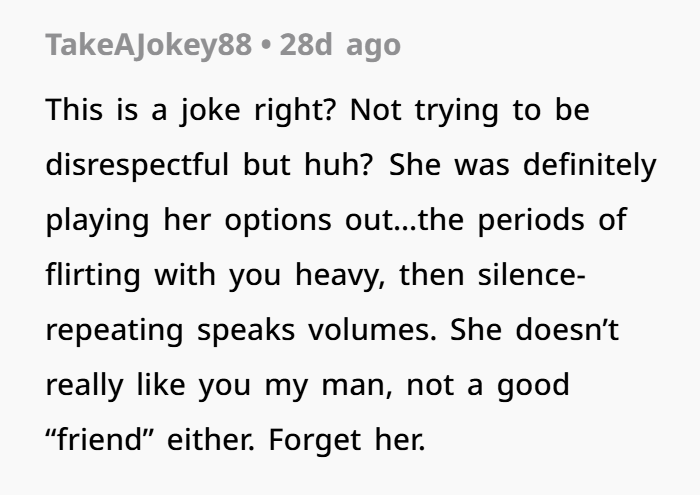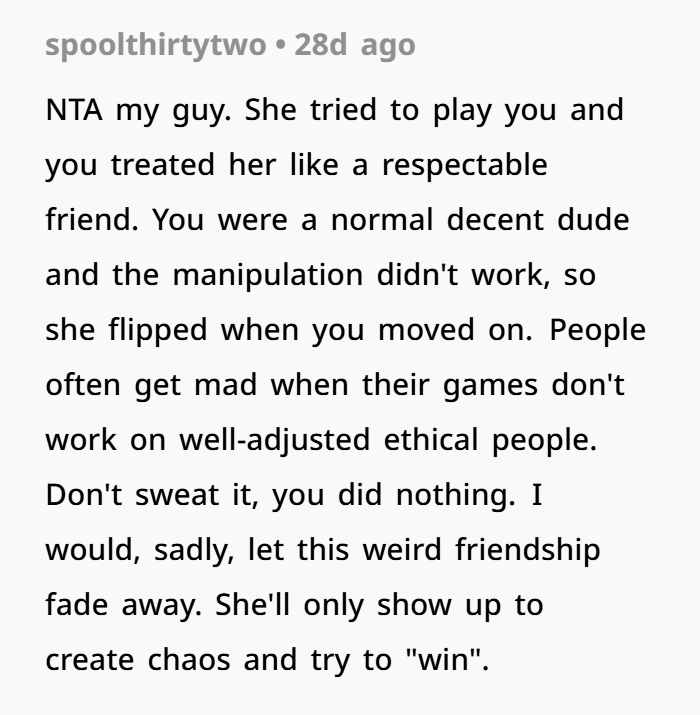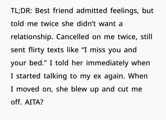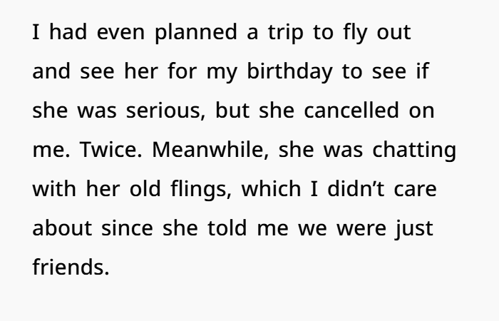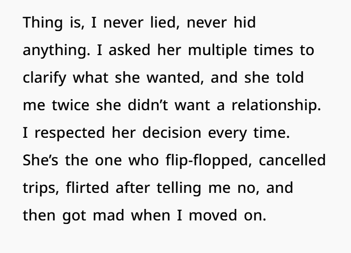Here’s the thing: I never hid anything. I asked Chloe multiple times what she wanted. Twice she told me she didn’t want a relationship. I honoured that. She’s the one who flip‑flopped, cancelled my birthday trip twice, messaged flirtatiously after saying “no”, then got angry when I moved on with someone else. So… AITA for moving on after she made it clear she didn’t want me?