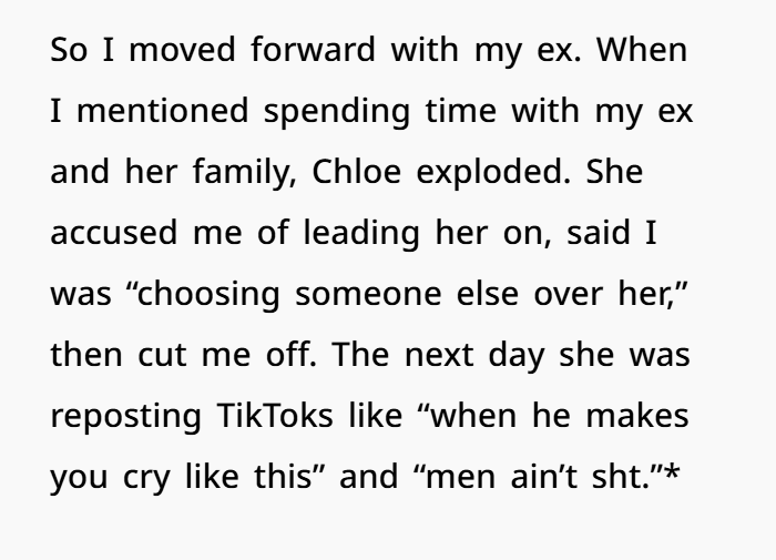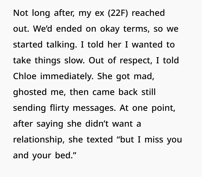 Then, my ex (22 F) reached out and we started talking casually; I told her I wanted to take things slow. Out of respect I told Chloe about starting to communicate with my ex. Chloe got mad, ghosted me, then came back sending flirty messages. After telling me she didn’t want a relationship, she texted: “but I miss you and your bed.” At that point I moved on with my ex. Mentioning I was spending time with my ex and her family triggered Chloe—she accused me of leading her on and “choosing someone else over her”, then cut me off.