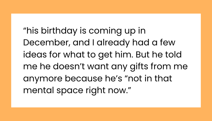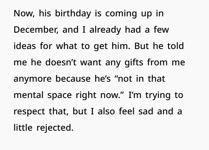You also mention he said he’s “not in that mental space,” that he didn’t want “big gifts” and now doesn’t want any gifts from you because he’s dealing with his own stuff. That is a real factor. If someone is struggling emotionally, what they can or want to do in relationships might look different.