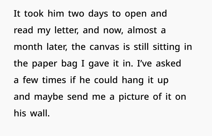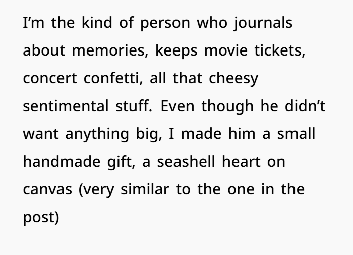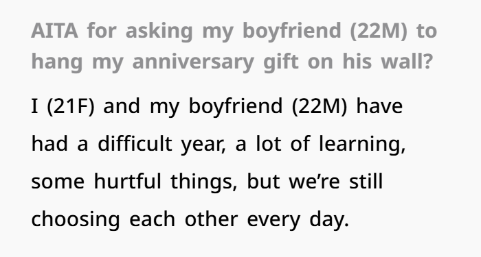 You and your boyfriend have made it two years together—a relationship that’s had its share of hard moments but also growth and choosing each other. For your anniversary, you respected his wish for something low‑key, yet you still gave a gift that means a lot to you: a handmade seashell heart on canvas, a letter and chocolates. He replied later that he loved the gift. But the canvas is still sitting in the paper bag, untouched on the wall. When you asked if he’d hang it and send a photo, he pushed back: “When you gift someone something … you’re not supposed to force them to use it.”