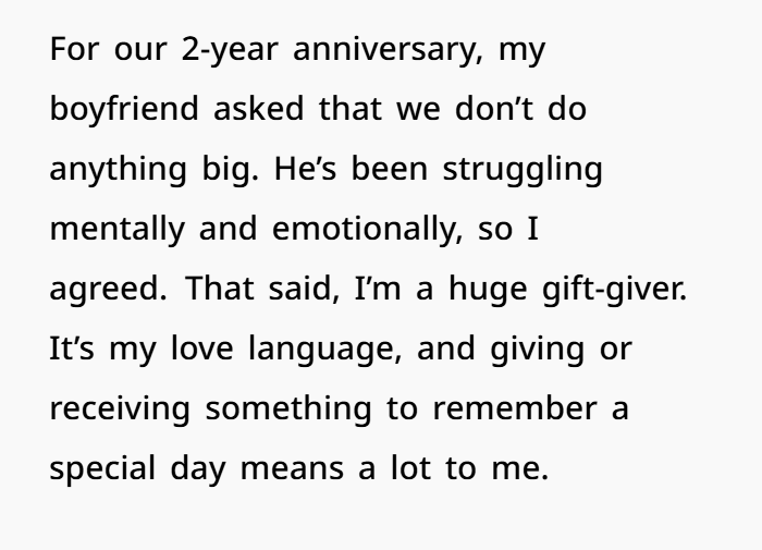 The poster explained that since her boyfriend had been struggling mentally, he didn’t want to do anything big for their second anniversary