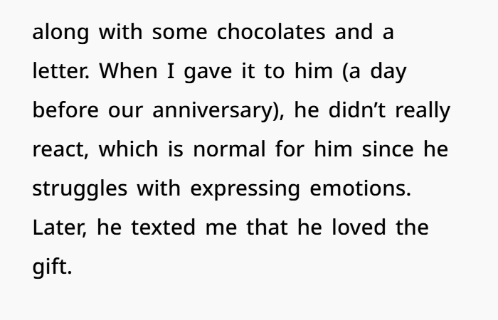 - Different love language: Gift‐giving might not be his primary love language—he might prefer acts of service, words of affirmation, or quality time. If that’s the case, he might feel the gift is nice, but doesn’t require the same kind of visible display.