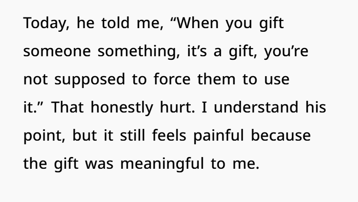 - Perception of obligation: His comment “you’re not supposed to force them to use it” suggests he sees your request as pressure. He might feel your request turns something generous into something with strings attached.
