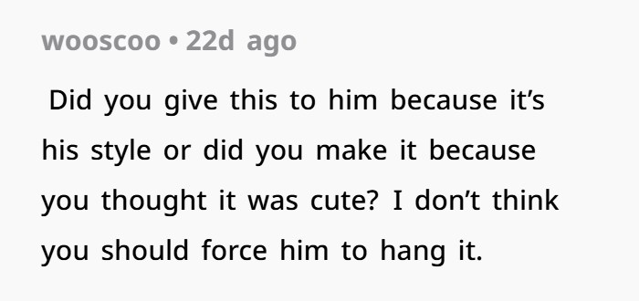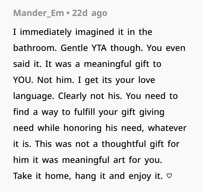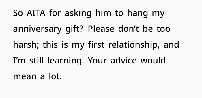 You’re wondering: Are you the asshole for asking him to hang the gift? Were your expectations unreasonable? Was his reaction valid?