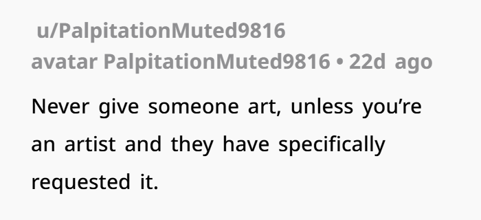 - Ask for his view: “I’m wondering how you see the gift now? Do you like it? Would you like to hang it? If not, is it okay if I keep it somewhere else knowing you appreciated it anyway?”