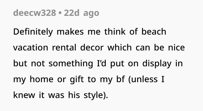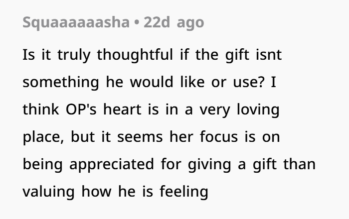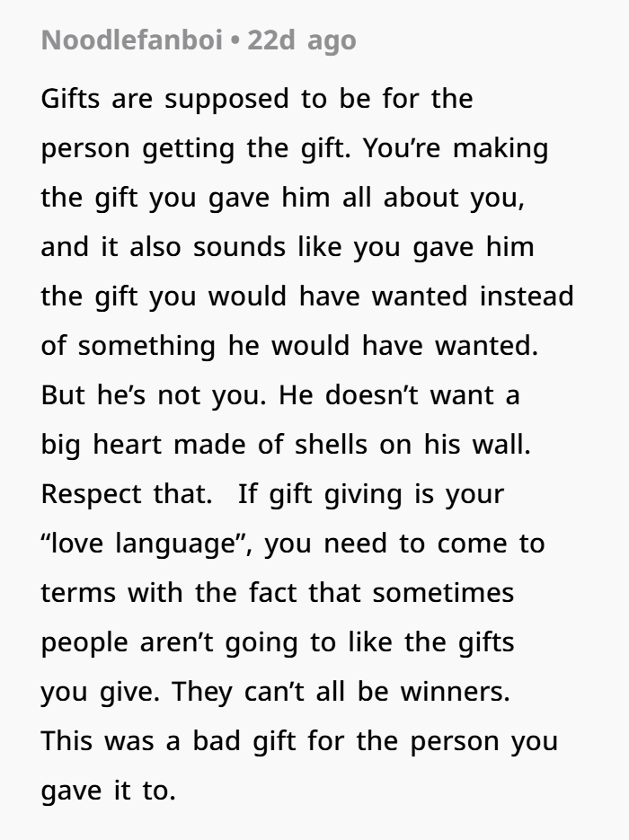 Most people didn’t like the poster’s gift and felt that she had selfishly given it to her boyfriend because it was something that gave her joy