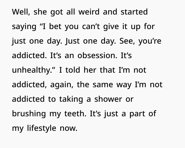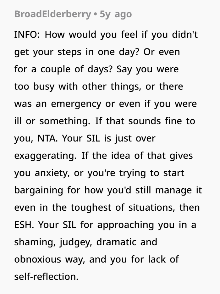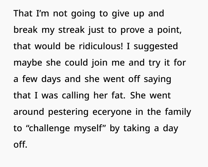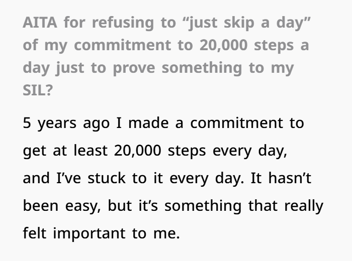 Your SIL’s challenge sounds more like a test — not a real concern for your well‑being — and trying to shame you into breaking your routine feels unfair.