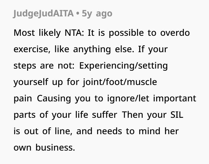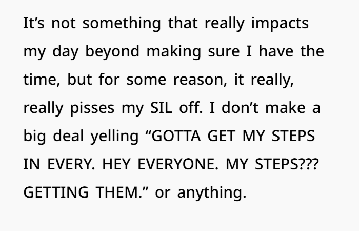 In social settings, sticking rigidly to the habit — especially when others want to relax — might come off as tone‑deaf or inconsiderate. That seems to be part of what triggered your SIL: to her, a strict walking regimen during a family gathering might look like you’re prioritizing yourself over family social harmony.