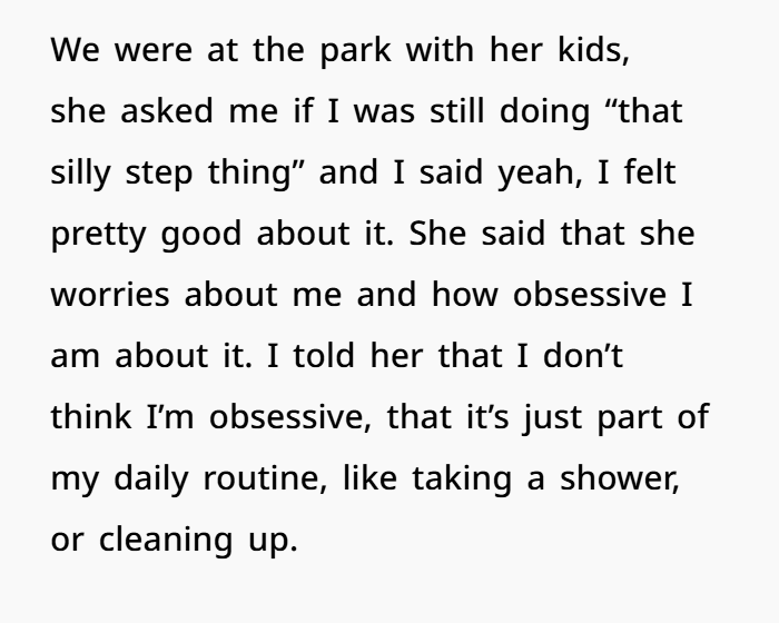 Now, my sister‑in‑law (SIL) tends to view this “20k‑steps‑a‑day” thing as some kind of weird obsession. While hanging out at the park with her kids, she asked if I still did “that silly step thing.” I said yes. She blurted out: “I bet you can’t give it up for just one day. Just one day. See — that’s how you know you’re addicted.” I told her walking is part of my daily life, like brushing teeth or showering. I refused to skip a day just to prove a point. Because, to me, breaking the streak would feel pointless, like giving up on something that saved me.
