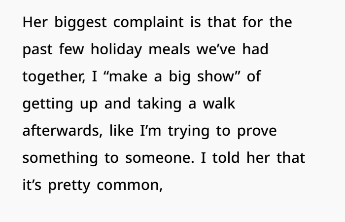 But… I also see where she’s coming from socially. Family time, holidays, meals — those are meant for connection, rest, togetherness. Maybe your strict walking routine in those contexts feels like you’re putting your goals above shared time. From that view, maybe skipping one day wouldn’t harm you — but might build peace.