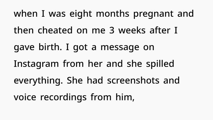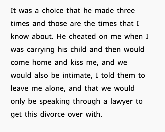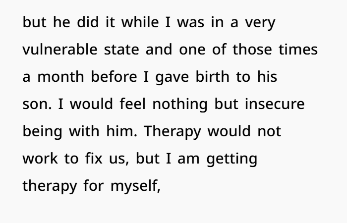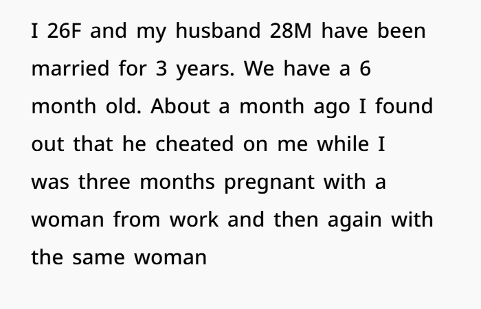 This isn’t your typical “oops I made a mistake” scenario. Her husband didn’t slip up once—he cheated three separate times with the same woman. Once at 3 months, again at 8 months, and then again just three weeks after their son was born.
