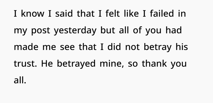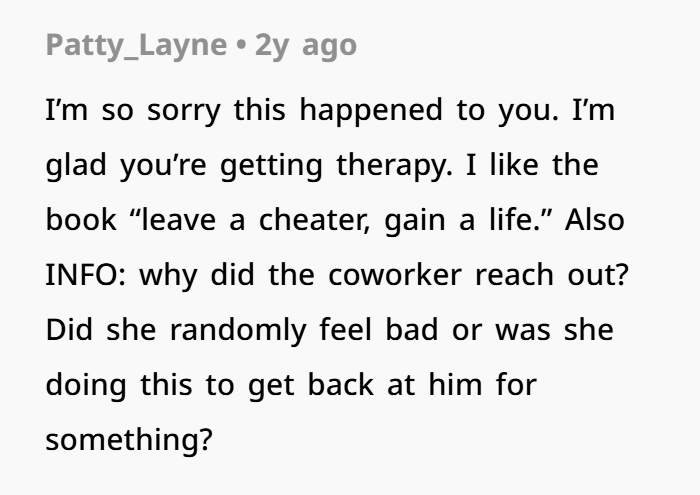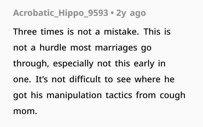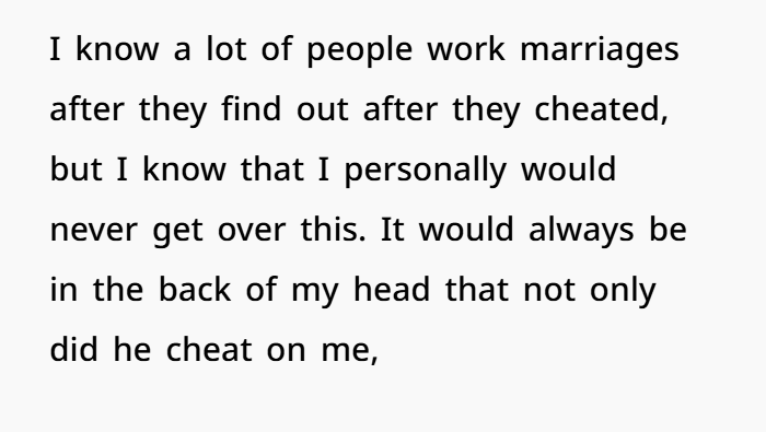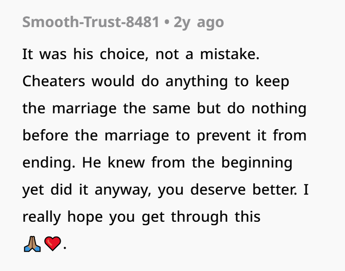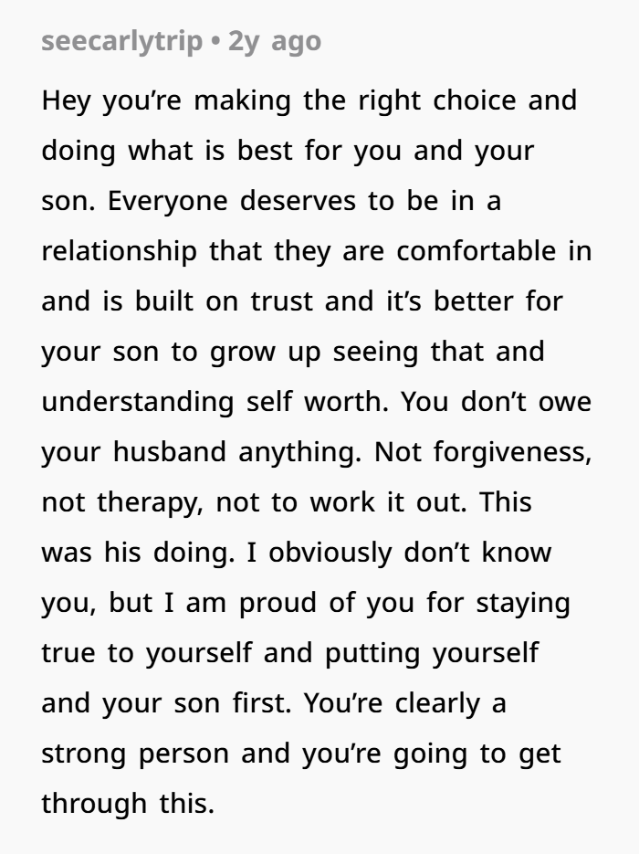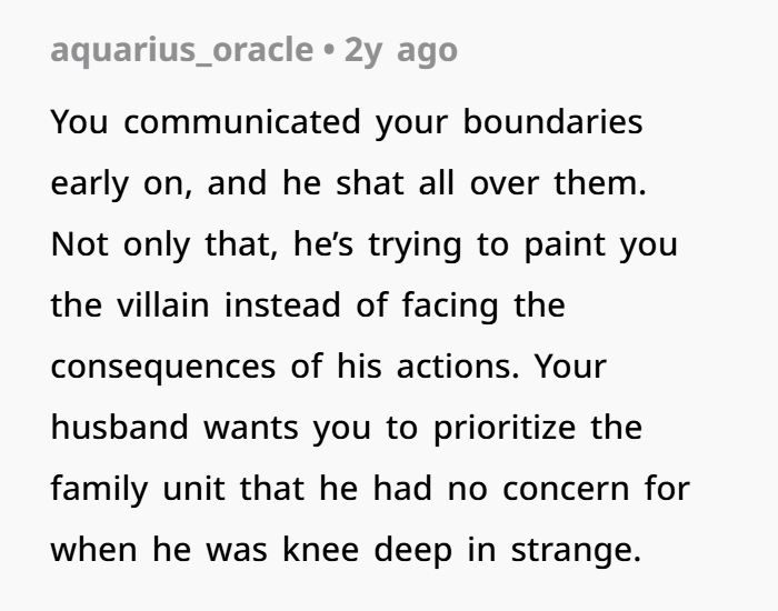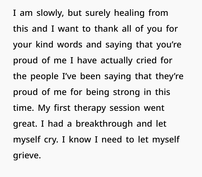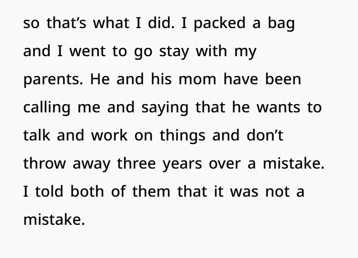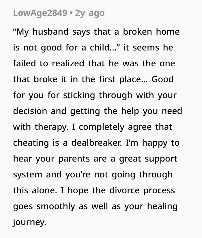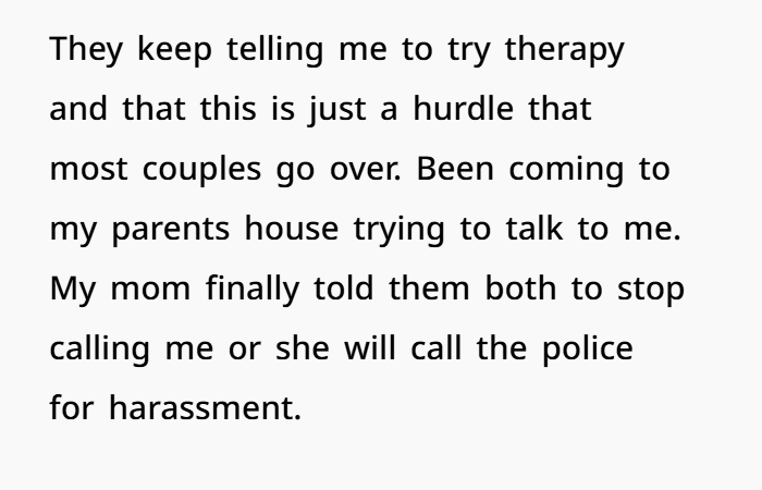 Her husband and MIL pushing for “couples therapy” is just another way of avoiding consequences. Therapy works when both people are willing to do the hard work. But in this case? She knows the truth: she’ll never trust him again. And it’s not her job to rebuild trust with someone who set it on fire.