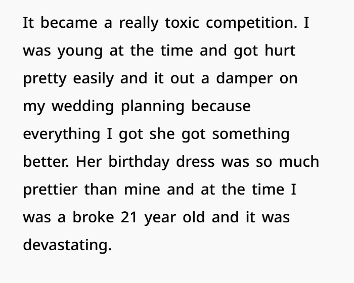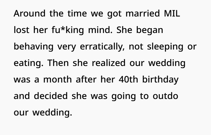 OP was only 21 during her wedding. That’s already a lot to handle emotionally and financially. Meanwhile, her MIL was hitting 40 and clearly dealing with something bigger. Not eating properly, not sleeping, acting all over the place—and then turning her birthday into a weird competition with the wedding. That’s not normal tension. That points more toward emotional instability or some kind of identity struggle, something often talked about in counseling or behavioral analysis.
