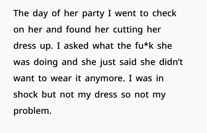 OP sees her cutting up her own dress. No explanation, just a random decision. Strange, yeah—but easy to ignore in the moment. Not your situation, so you move on.