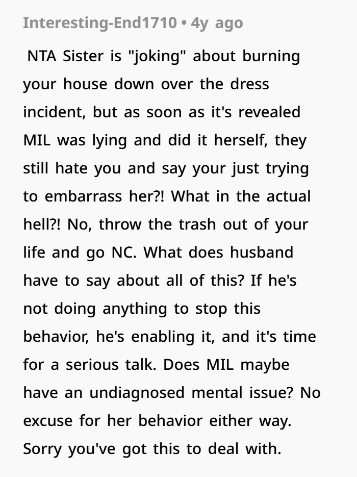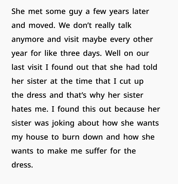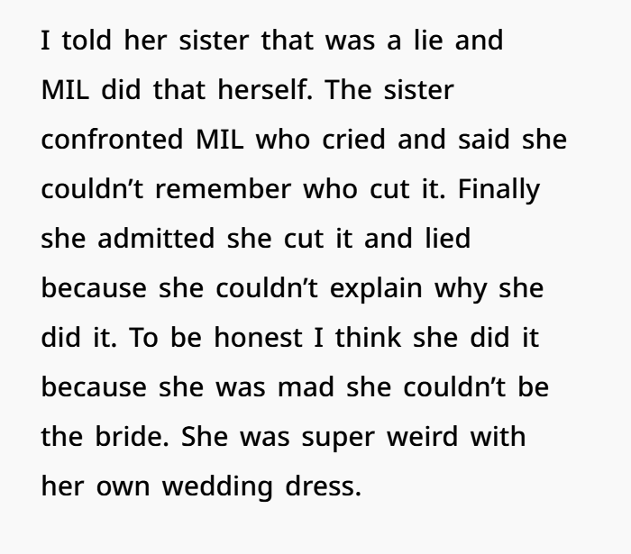 Years later, everything flips. During a visit, the truth comes out—and it’s worse than expected. The MIL had been telling everyone that the OP destroyed the dress, and that lie stuck. It built resentment over time, even leading to extreme reactions like her sister-in-law admitting she wished harm on her. That’s not just a misunderstanding—that’s serious emotional fallout and damage to personal reputation, something often talked about in conflict resolution and mental health discussions. When the OP finally confronts her, the MIL admits she lied—but only because she couldn’t explain her own behavior. And instead of apologizing properly, she downplays it and accuses the OP of overreacting. So now the OP is left questioning herself—was asking for accountability too much, or is she just dealing with someone who refuses to take responsibility?