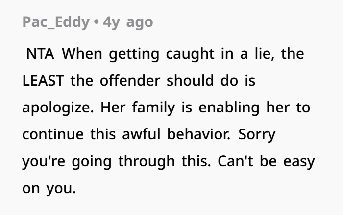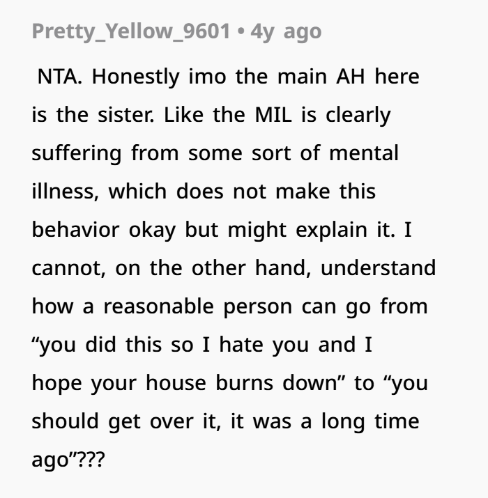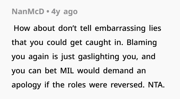 Instead of explaining her behavior, the MIL created a different story. She told her sister that OP did it. And that lie didn’t just sit quietly—it spread and shaped opinions over the years.