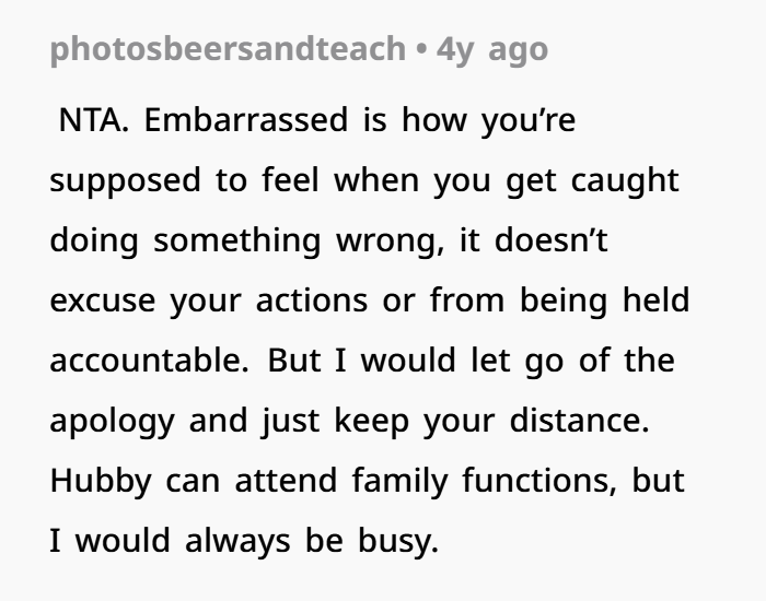 And right now, what OP asked for wasn’t punishment, revenge, or even distance.