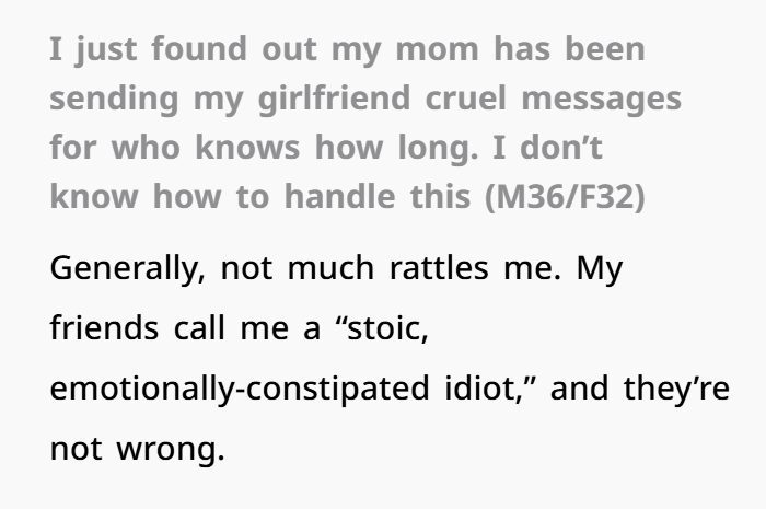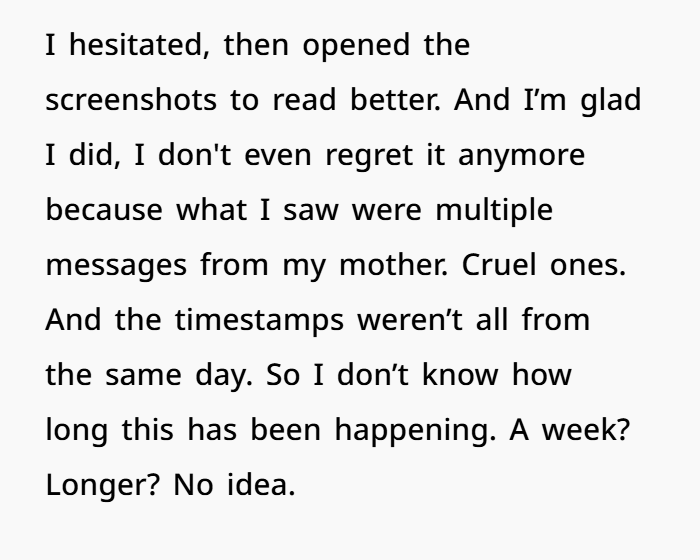 In a moment of innocent phone-borrowing, a 36-year-old man stumbles onto a heartbreaking truth: his mother has been sending cruel, demeaning messages to his girlfriend of eight years. The screenshots weren’t just recent—they spanned days, maybe weeks. His girlfriend, a kind, conflict-avoiding professor, never mentioned it. She chose to quietly endure the hate rather than disrupt the relationship between her boyfriend and his mother.