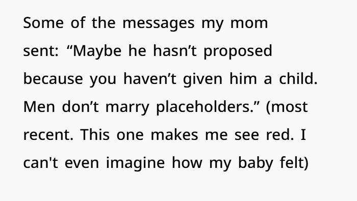 “Hey. I saw some messages from my mom on your phone. I wasn’t snooping, it just popped up while I was on IG. And I gotta tell you, I’m furious. Not at you. At her. I’m so sorry you’ve had to deal with that. You didn’t deserve any of it. I love you, and I want you to know you don’t have to protect me from her. I’ve got your back—always.”
