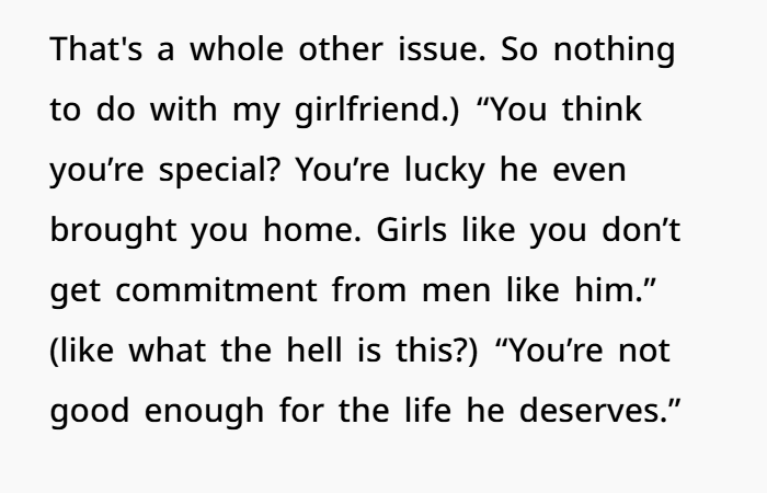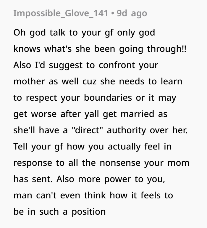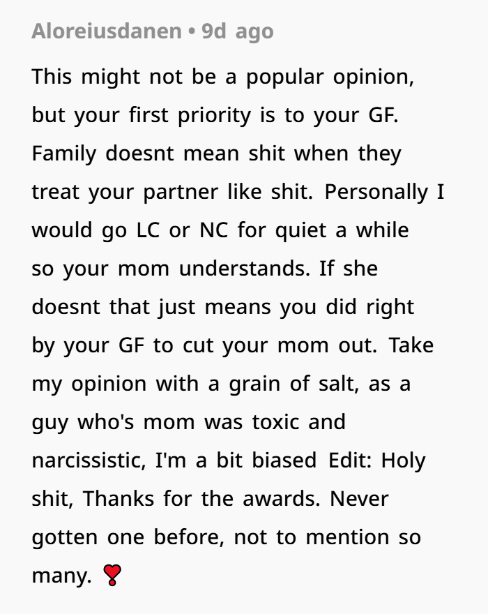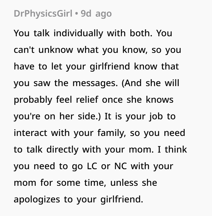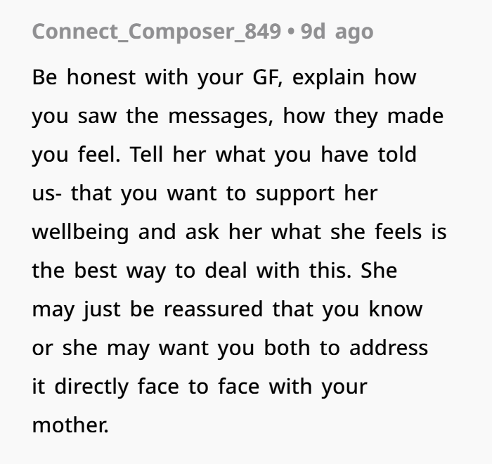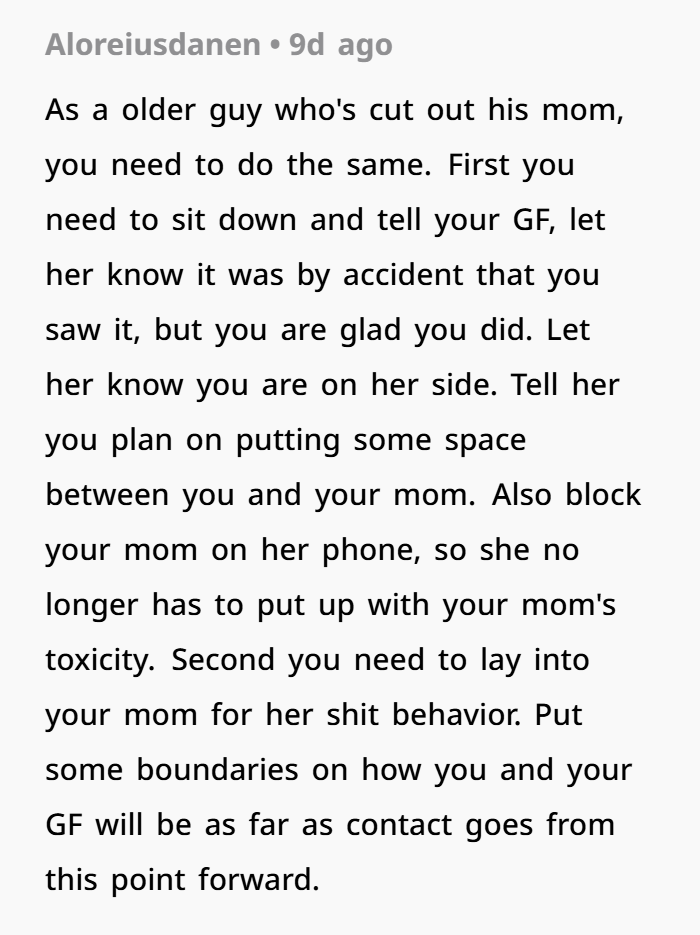 That’s what’s happening here. When your girlfriend reads, “You’re not good enough for the life he deserves,” that’s a hit to her self-worth. And it’s coming from your mom, someone who should be a safe figure.