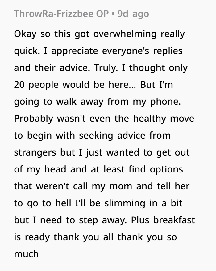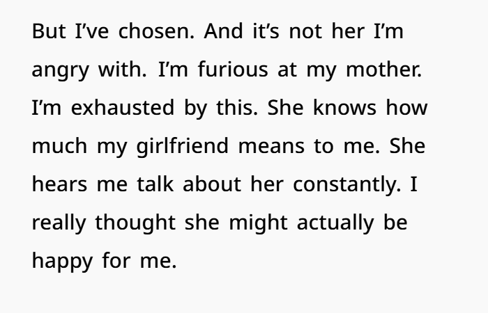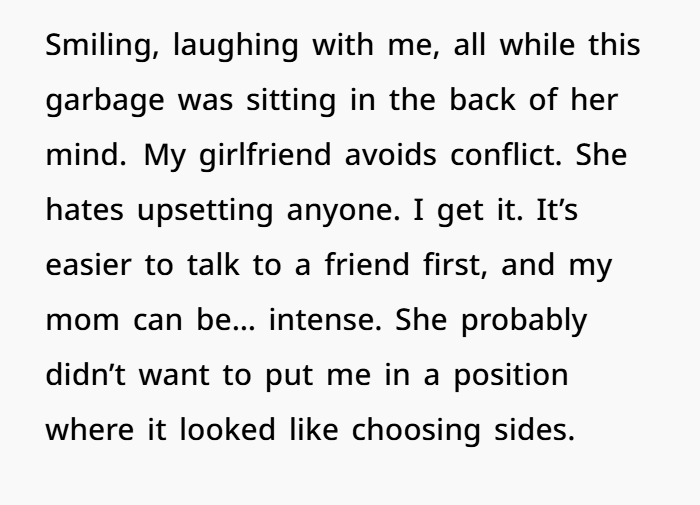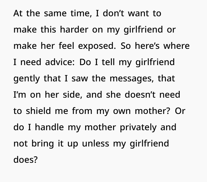 Now, torn between rage and sorrow, he faces an emotional minefield. Should he confront his mother privately or let his girlfriend know she doesn’t have to carry this alone anymore? The dilemma isn’t just about family drama—it’s about emotional abuse, setting boundaries, and protecting someone you love from the people who are supposed to love you too.