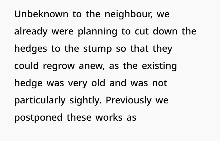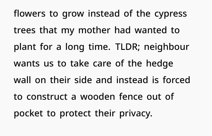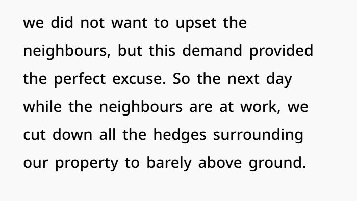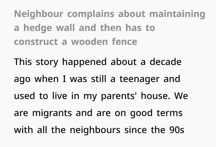 This story goes back to when a teenager and their family lived in a house with a thick hedge wall separating them from the neighbors. On their side, the hedge was neat and well-kept. No issues. But the neighbor started complaining about how it looked from their side. Constant comments. Nitpicking. The family was big on DIY home improvement and property upgrades, so instead of paying for hedge maintenance they didn’t even need, they made a bold move. They removed the hedge completely. No trimming. No upkeep. Just gone. Which meant the neighbor suddenly had zero privacy and now had to pay out of pocket to build a fence.