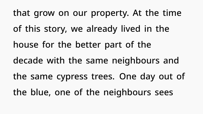 This all kicked off one day when the teen’s mom was outside gardening, working on the big living hedge that separated their yard from the neighbor’s. It was made of old cypress trees that had grown into a thick green wall over the years. The family always trimmed their side and left the neighbor to deal with theirs. That had always been the unspoken rule. Until suddenly, the neighbor walked over with a complaint.