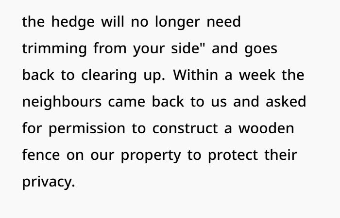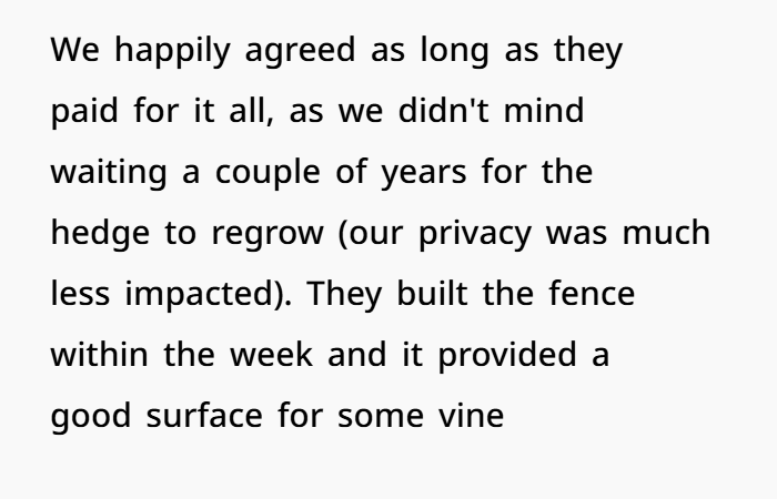Not long after, the neighbors came back again, this time with a new request. They asked if they could build a wooden fence for privacy. On the family’s property. The family didn’t really care. They had no privacy issues and planned to let the hedge grow back eventually anyway. So they agreed—on one condition. The neighbors had to pay for everything.