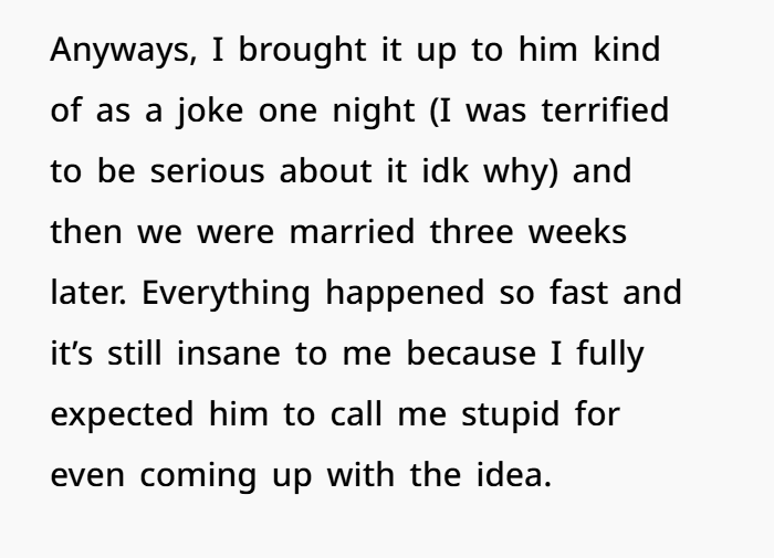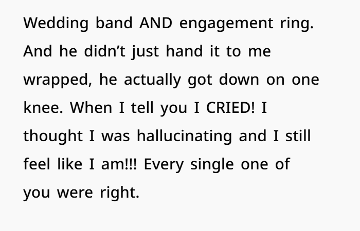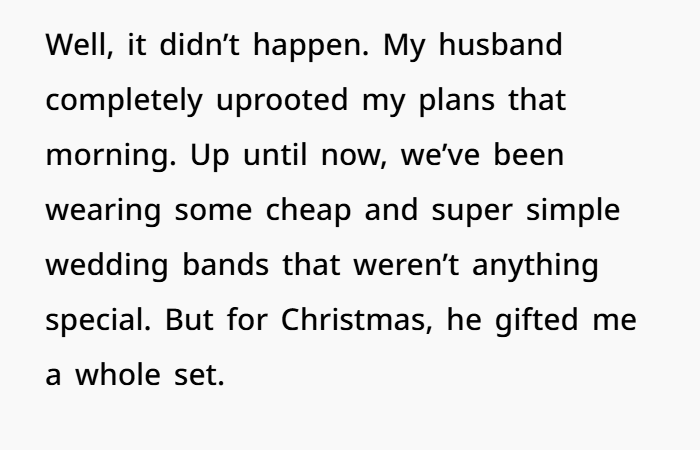But the biggest surprise came at Christmas. What I thought would be just another holiday turned into a moment I’ll never forget. He gifted me a new set of wedding rings, a beautiful wedding band, and an engagement ring. But it wasn’t just the rings—it was how he gave them to me. He got down on one knee, just like a proposal, and that’s when I knew: this wasn’t just a marriage of convenience to him. He had been in love with me for years, but he’d never told me until that moment. I was in shock, crying, and feeling like everything I thought I knew about our relationship had just shifted completely.
