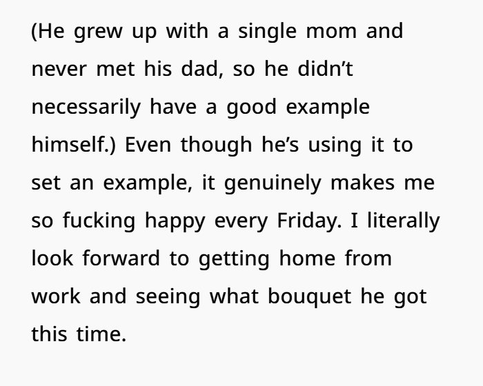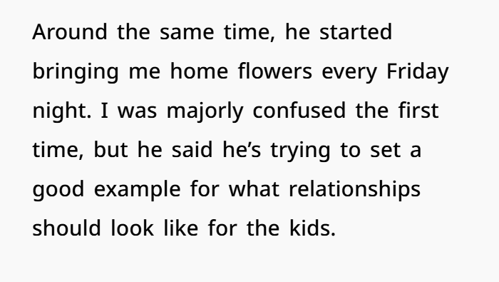 Things kept shifting between us. Every Friday night, he started bringing me home flowers—something I never expected from him. It wasn’t even a romantic gesture, but more of a “this is what I should be doing to show the kids what a relationship looks like” kind of thing. At least, that’s what he told me. But despite the reason behind it, it made me so happy. Each bouquet felt like a small piece of love that he was giving me, and I began to look forward to them every week.