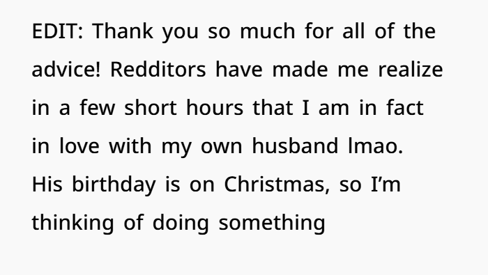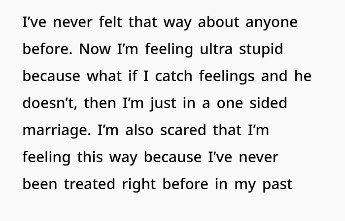 At first, I thought I was imagining things. But as the weeks went on, I started looking forward to it every day. I felt butterflies, and I realized I had never felt this way before about anyone. It’s such a weird feeling, and I found myself thinking, “Am I falling in love with him?” I was nervous about what this meant, especially considering our marriage had started out of convenience.