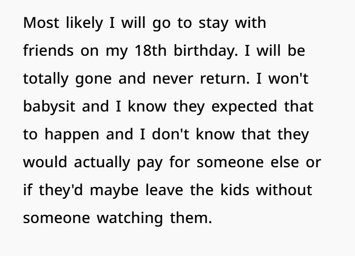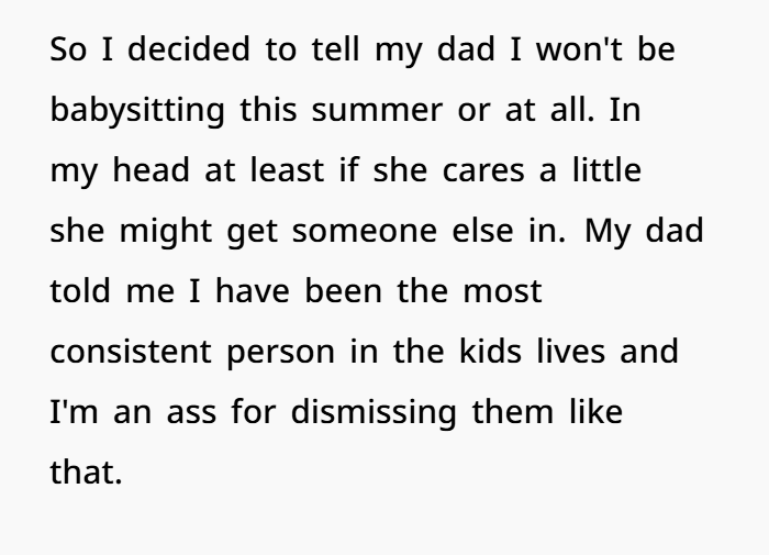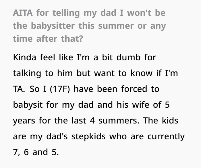 You’re a 17‑year‑old who’s been routinely pressured into babysitting your dad’s three young stepkids (ages 7, 6 and 5) for four straight summers. You made the decision to tell your dad: you won’t be babysitting this coming summer or ever again after, because you’ve planned to move out soon (on your 18th birthday) and you don’t want to be stuck in this role indefinitely.